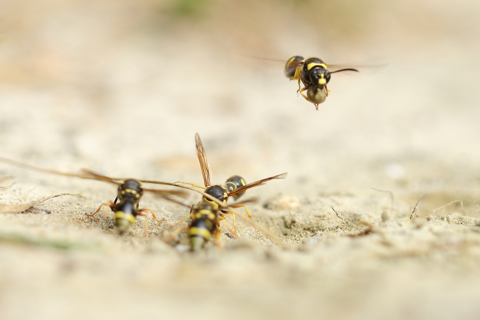 Ze verzamelen een beetje zand/leem en maken daar een bolletje van. Dit bolletje gebruiken ze om een urntje te bouwen, iedere wesp zijn eigen urntje.