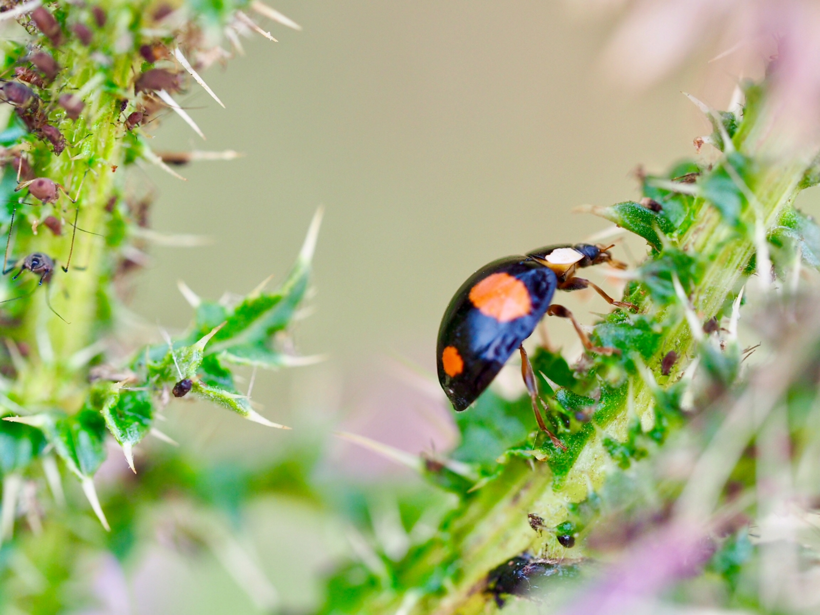 Veel luis op de distels voor dit veelkleurig aziatisch lieveheersbeestje