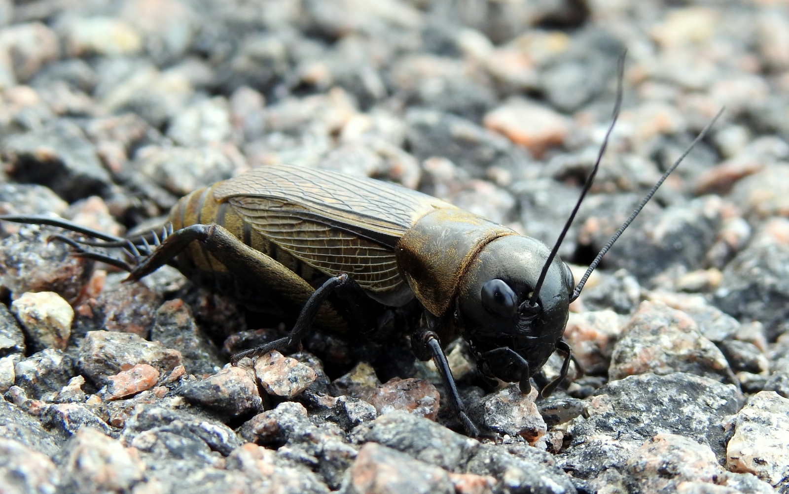 In eerste instantie dacht ik (op afstand) een veenmol te zien, maar nee, het was een veldkrekel ( ik wist niet dat ze zo groot zijn). Deze houdt van zonnige, droge en schrale, licht begroeide plaatsen. Hij vliegt niet en hij klimt niet. Hij leeft deels ondergronds. Hij eet grassen en kruiden, maar ook hun wortels, zaden en kiemen en ook kleine geleedpotigen worden gegeten. Zelf zijn ze voer voor zoogdieren en vogels. De mannetjes worden 18 tot 26 mm lang, vrouwtjes worden 19 tot 27 mm.