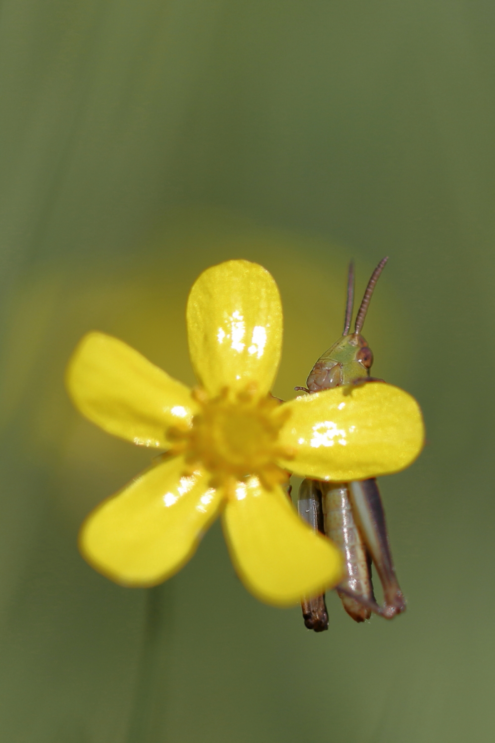 Schitterende foto! Een wasachtig bloempje, waarachter de sprinkhaan zich probeert te verschuilen...