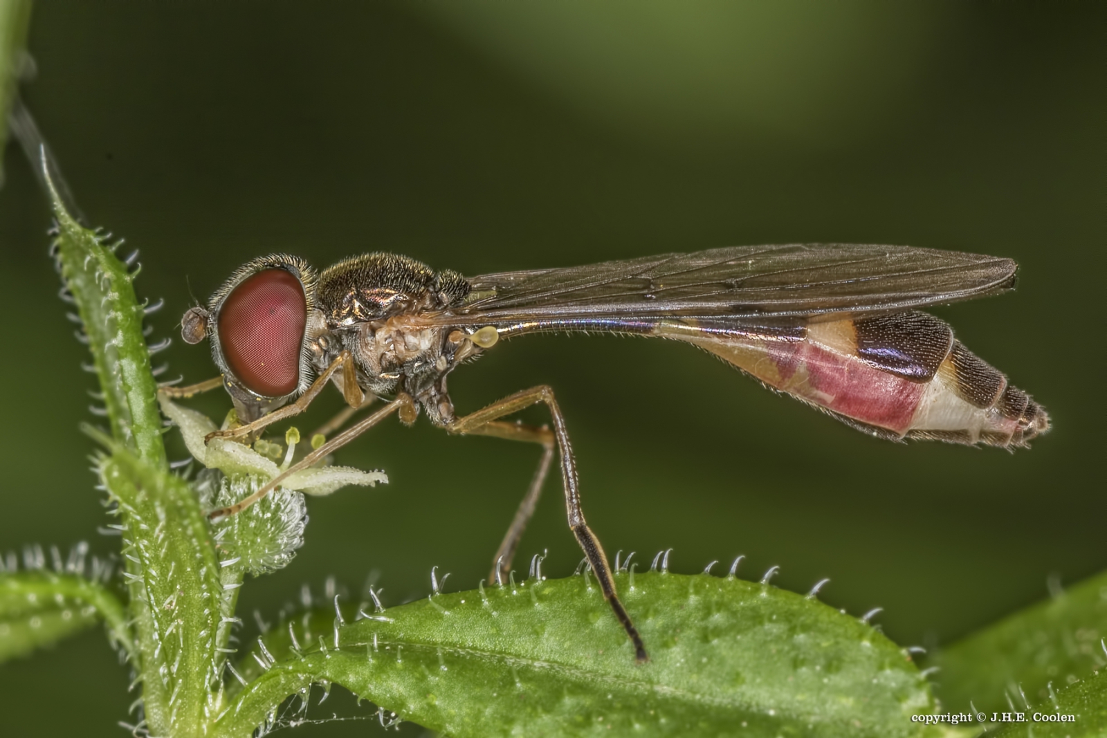 Een lange, maar kleine, zeer dunne zweefvlieg met een knotsvormig achterlijf. Het is een van de weinig zweefvliegen waar de steel van het achterlijf smaller is dan de breedte van het schildje. Ze vliegen in bossen, waarbij ze graag in de schaduw blijven. Daar zijn ze tussen de kruidvegetatie en op bloemen te vinden. Gr. Jan