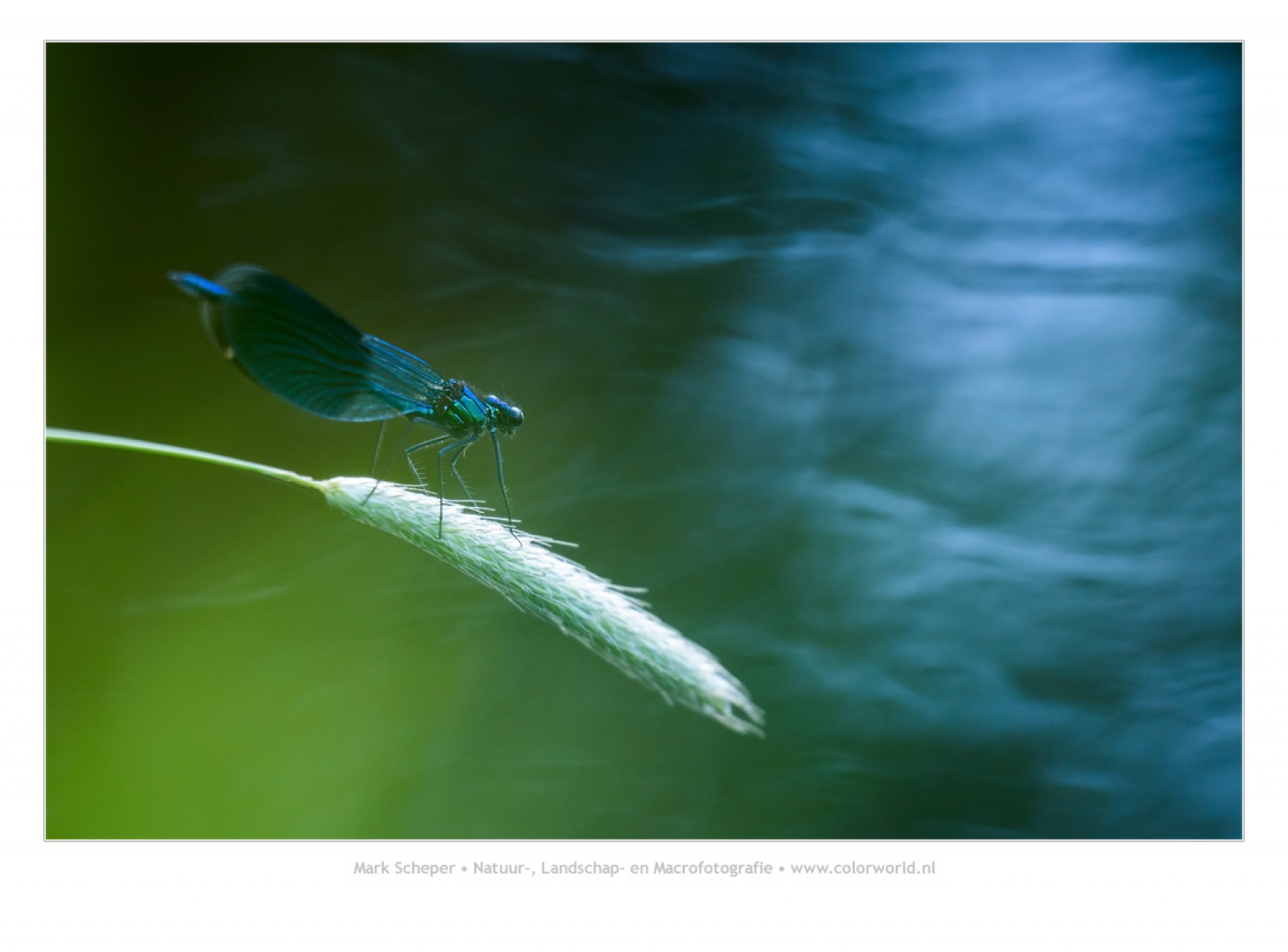 Weidebeekjuffer (Calopteryx splendens). Altijd wel een uitdaging zonder zelf in het water te belanden :)