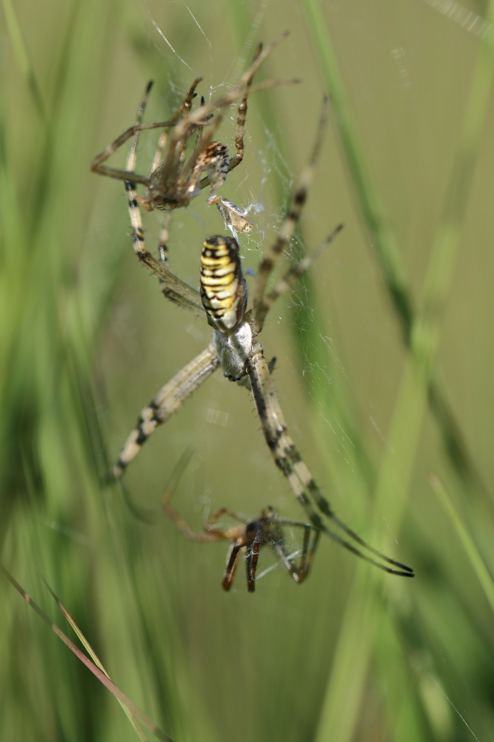 In het midden zit overduidelijk een wespspin, in dit geval het vrouwtje. Boven hangt [van ditzelfde vrouwtje] haar vervellingshuidje. Onderaan hangt mannetje wespspin, ingesponnen in dit geval want zo eindigt dat vaak bij deze soort; na de paring wordt hij opgegeten……