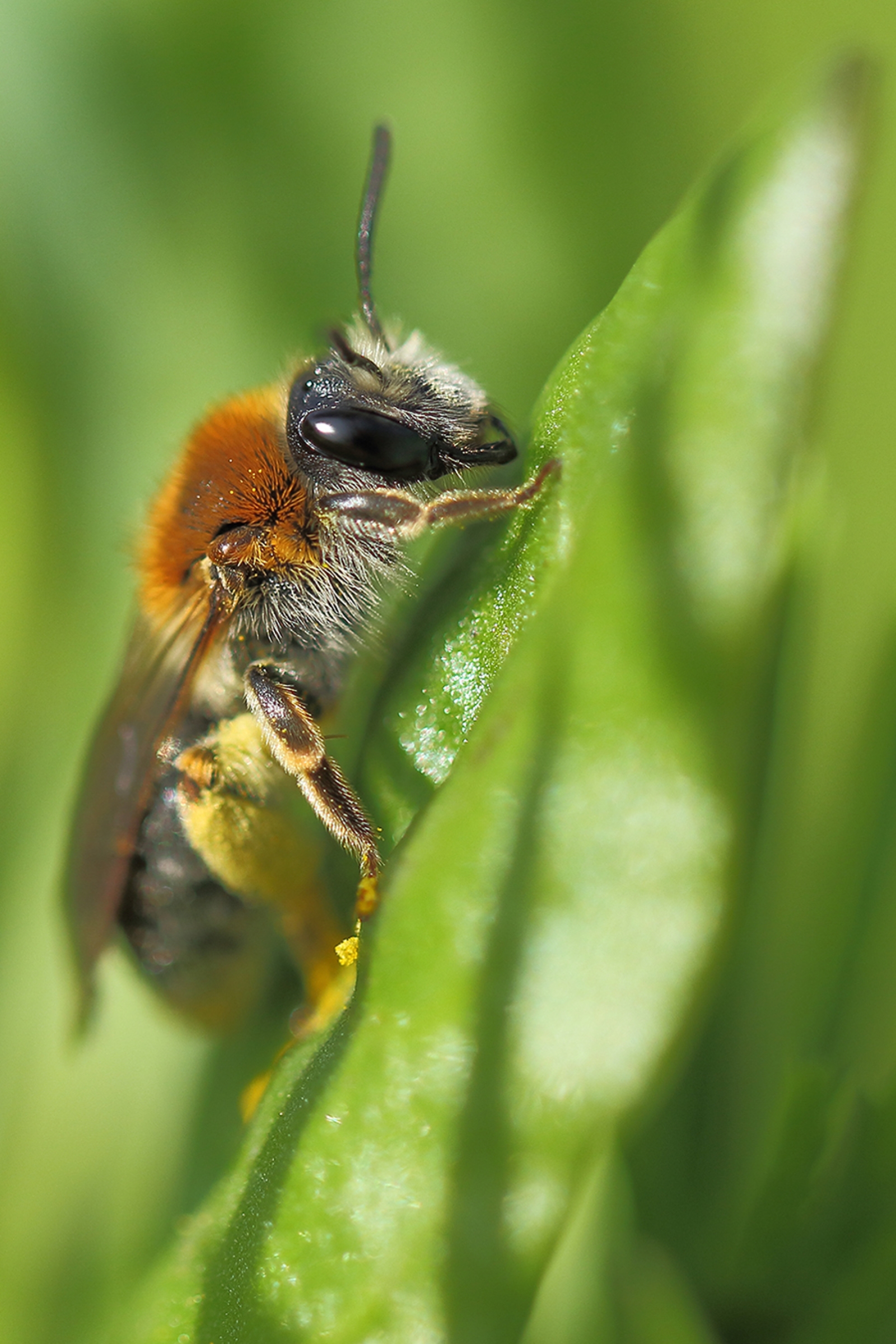 Het roodgatje is één van onze algemeenste zandbijen. Zowel bij de mannetjes als de vrouwtjes zijn de achterpoten doorschijnend oranje gekleurd.