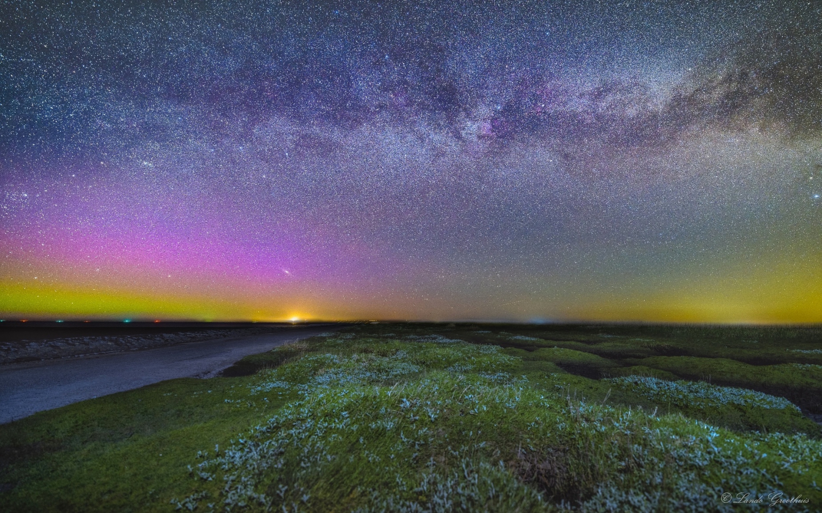 Afgelopen nacht was het noorderlicht goed zichtbaar vanaf de Nederlandse noordkust. Deze foto is genomen omstreeks 01:00 uur op zondagochtend/nacht 06-05-2018. Een mooie paarse gloed en daaronder een groene band die boven Ameland lijkt te hangen. Tevens een mooi stukje van de melkweg die de rest van de hemel siert.