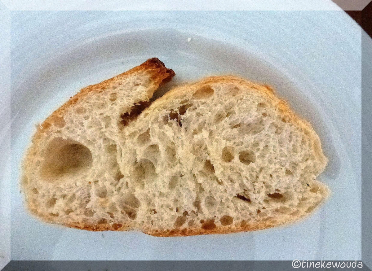 Bij het eten heerlijk vers brood geserveerd krijgen. Maar dit broodje gaat eerst uitgebreid op de foto. De obers vonden ons maar gek met onze konijnenbroodtic!
