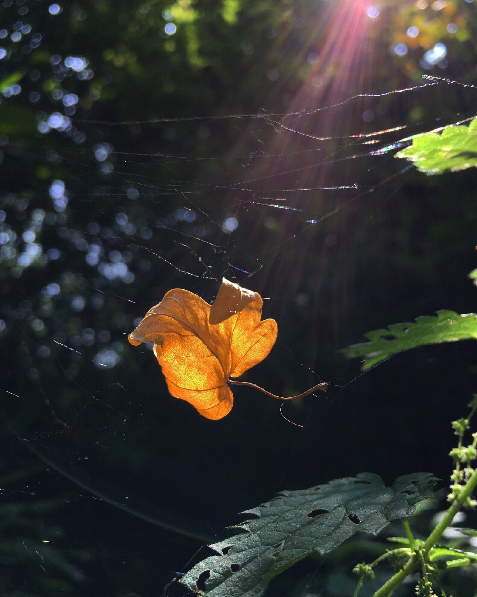 Dit blaadje zat gevangen in een web en de zon scheen er mooi op