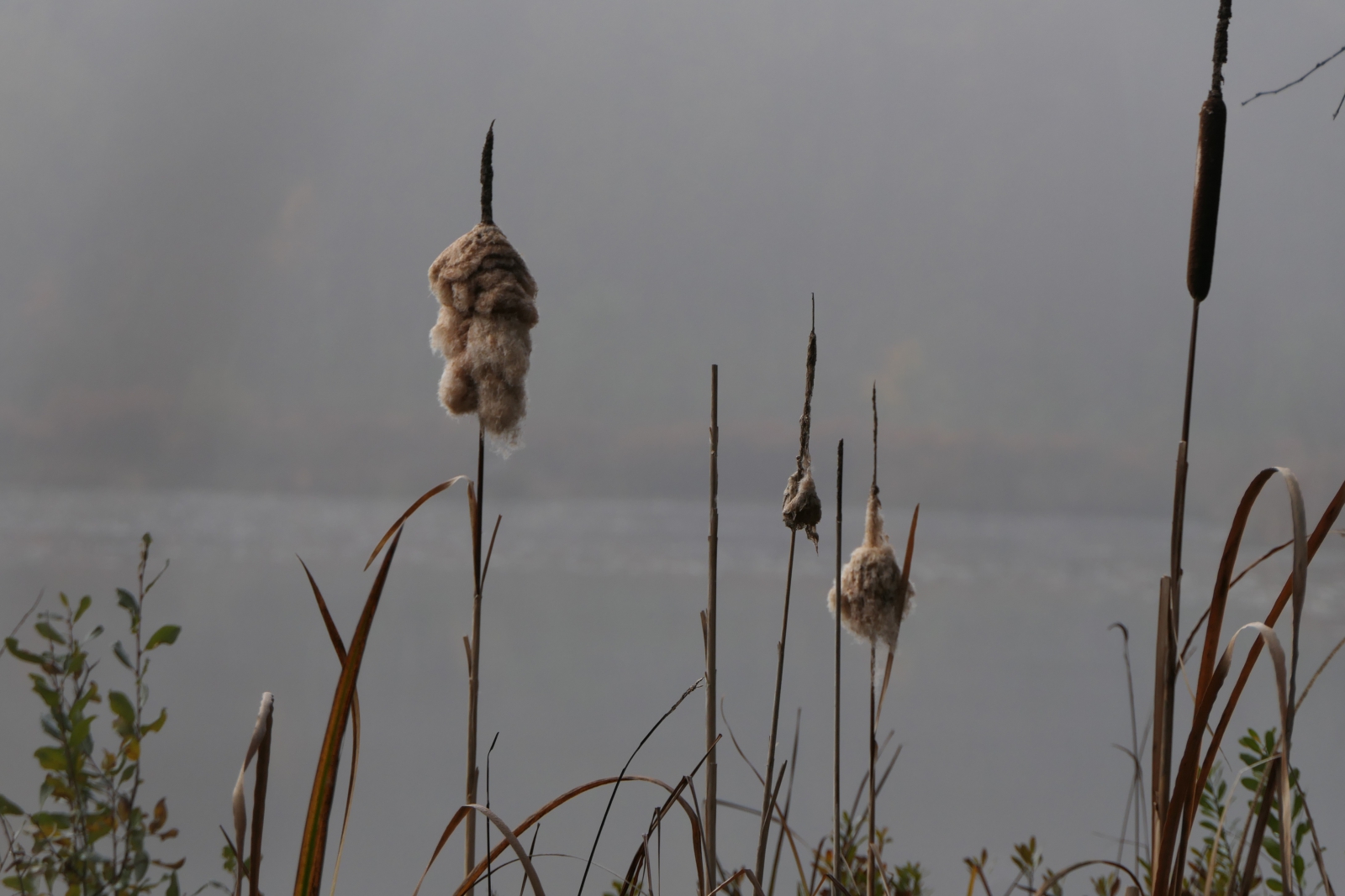 De lisdoddes langs het ven. De ene lijkt nog op een sigaar en is nog heel, terwijl de andere al helemaal opengeklapt en pluizig is.