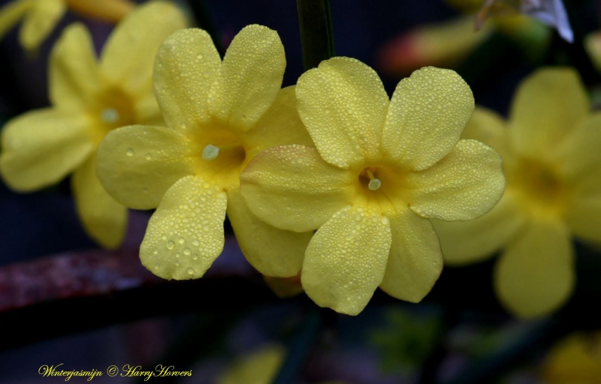 Jasminum nudiflorum - Winterjasmijn met kleine dauwdruppeltjes
