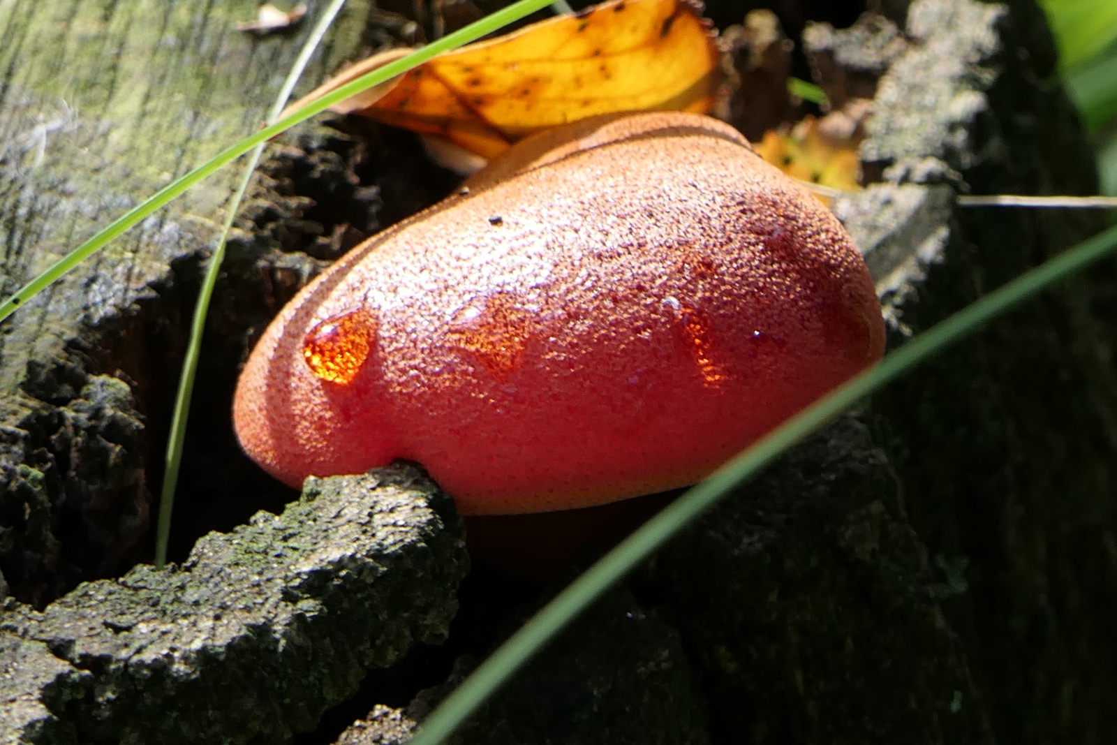 Deze biefstukzwam ? groeide aan een oude boomstronk. Mooi om te zien met z'n rood oranje kleur.