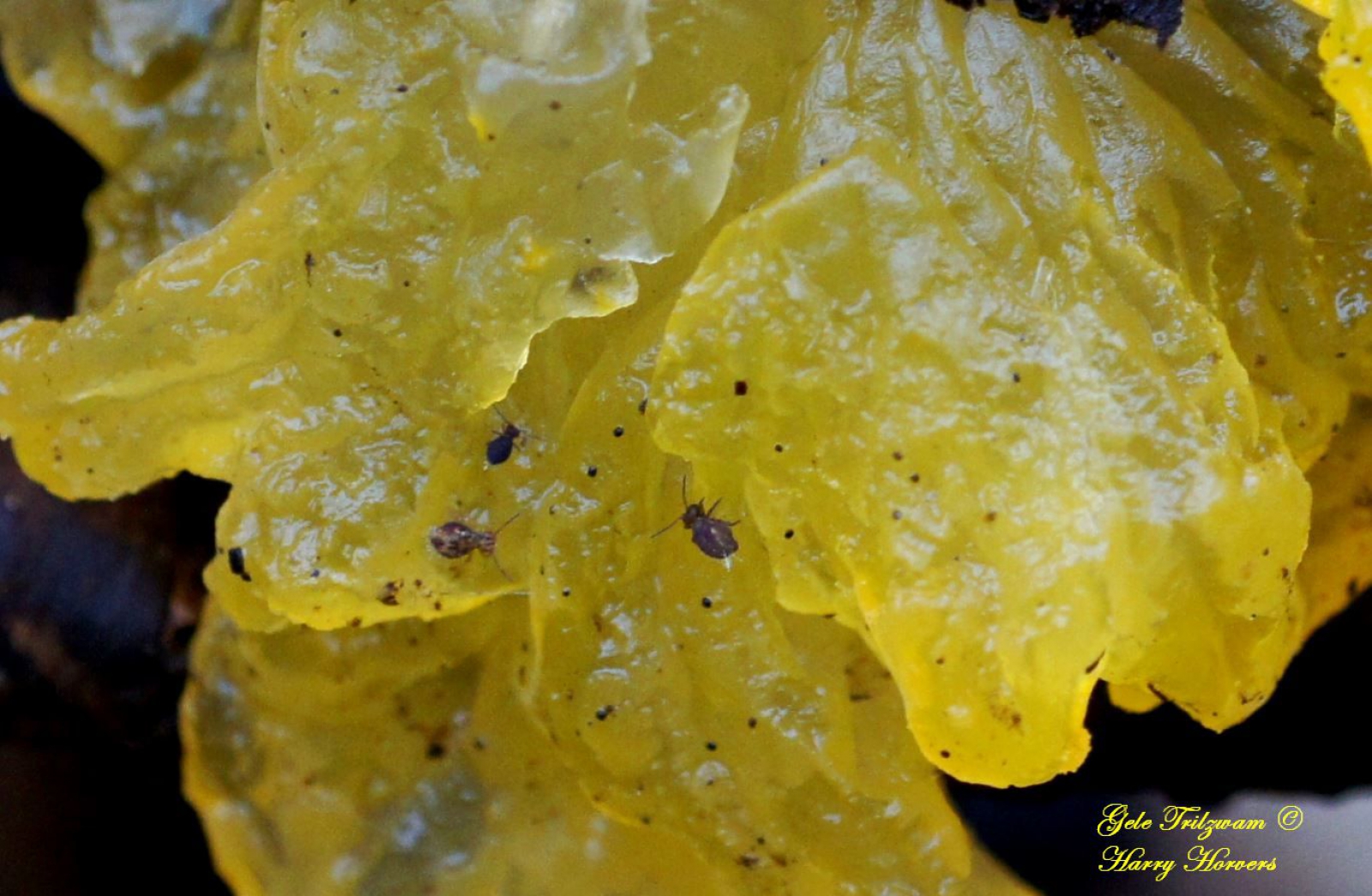 gele trilzwam met kleine beestjes, waarschijnlijk leven die van deze zwammen ...want je ziet ze op elke gele trilzwam
