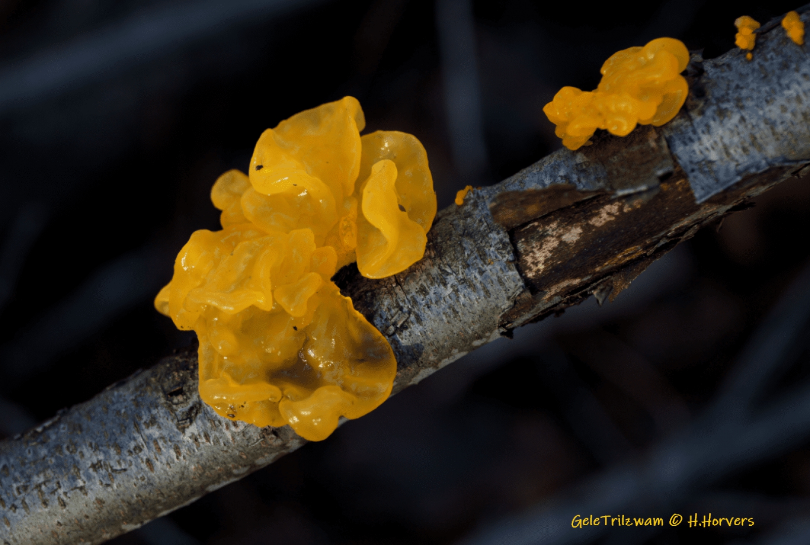 Gele Trilzwam Nu de bladeren van de bomen en struiken zijn, vind je ze een stuk gemakkelijker