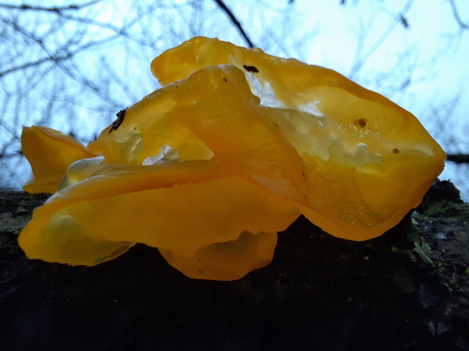 Op deze natte vierde januari zag ik opeens heel veel oranje/gele schimmels/zwammen/paddenstoelen in het Bentwoud! Zo mooi, glazig, bijna lichtjes.
