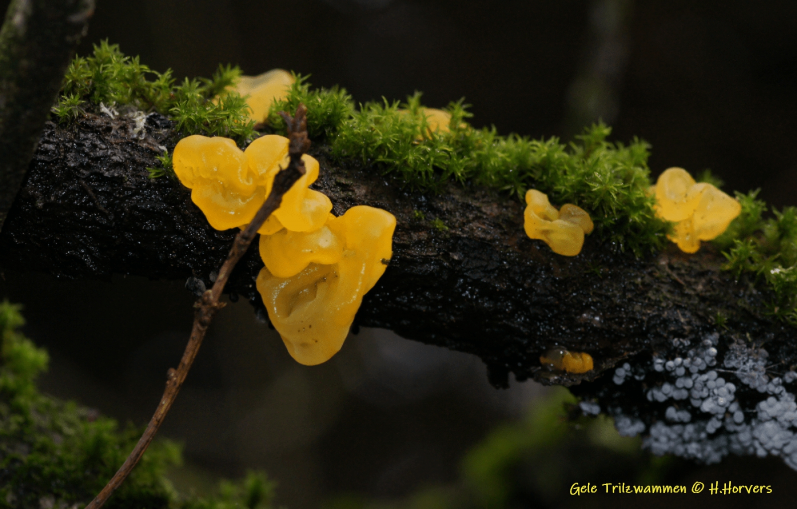 Gele Trilzwammetjes. onder de tak zitten ook kleine witte zwammetjes... die moet ik nog eens nader bekijken , als ik ze terug kan vinden...