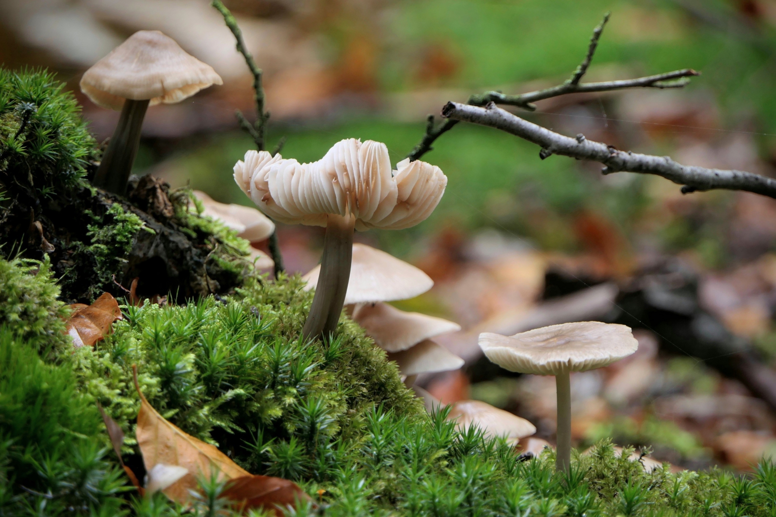 Een rijtje paddenstoelen waaronder de helmmycena.