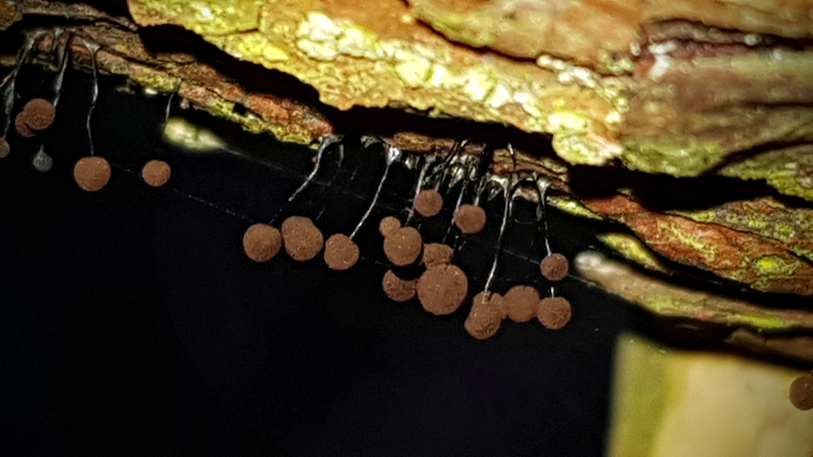 Lang gezocht en uiteindelijk gevonden. Ze zijn bijna niet te zien een paar mm hoog en ze hingen onder een tak van een omgevallen boom. Het was al vrij schemerig dus moest ik de flits gebruiken. Ze zijn prachtig om te zien.