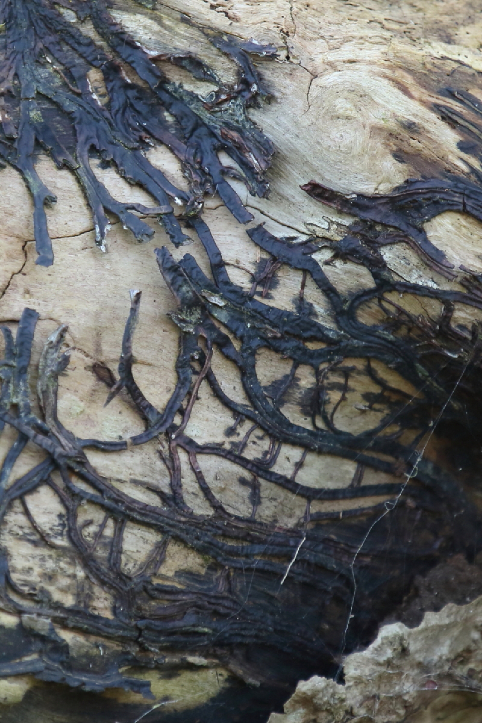 Eigenlijk geen schimmeldraden maar rhizomorfen. Dit zijn kabels waarbinnen schimmeldraden van honingzwammen zich van boom naar boom verspreiden.