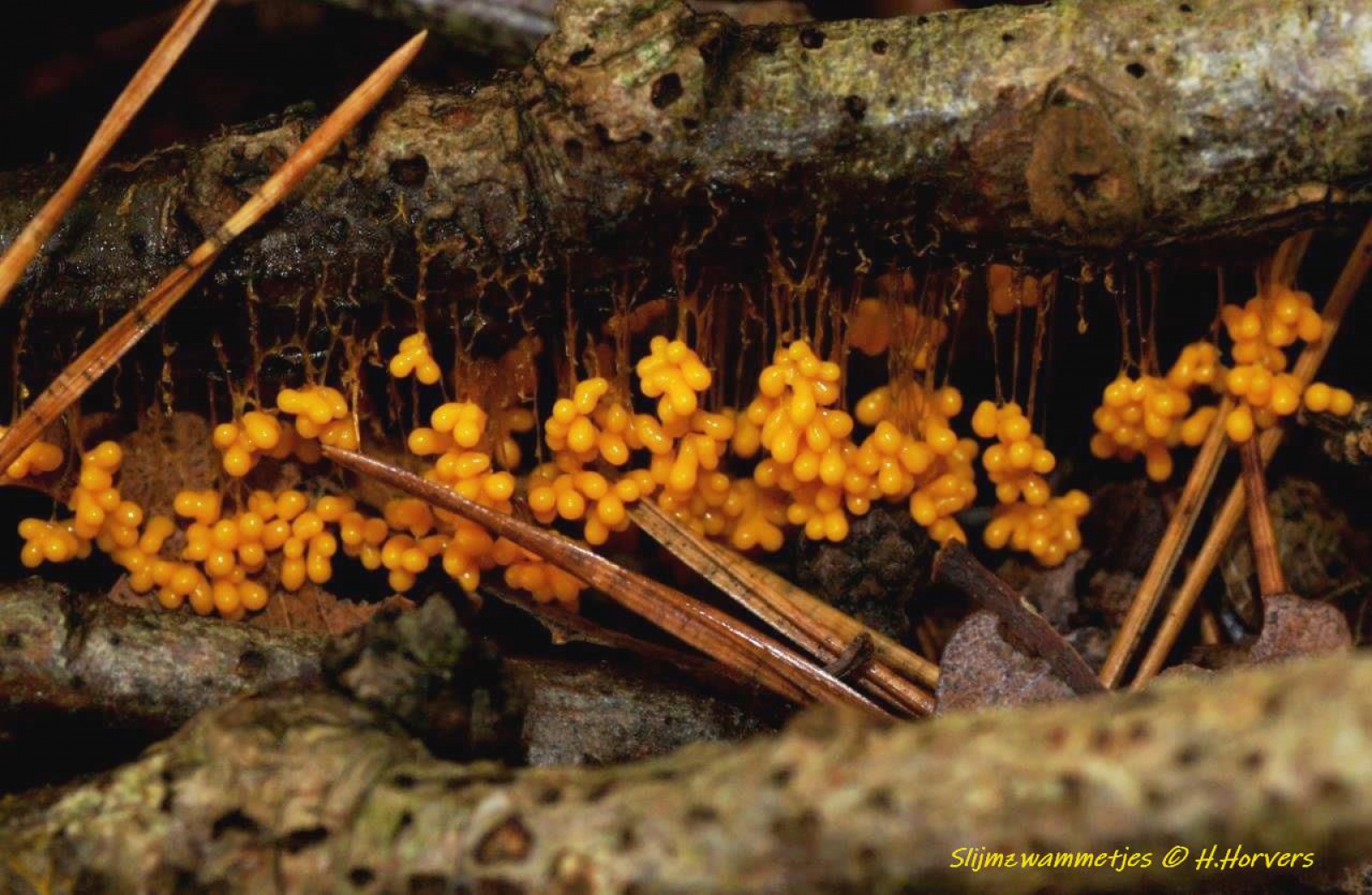 Gele Slijmzwammetjes, om een idee te geven van de grote... de takjes die je op de foto meent te zien... zijn dennennaalden.