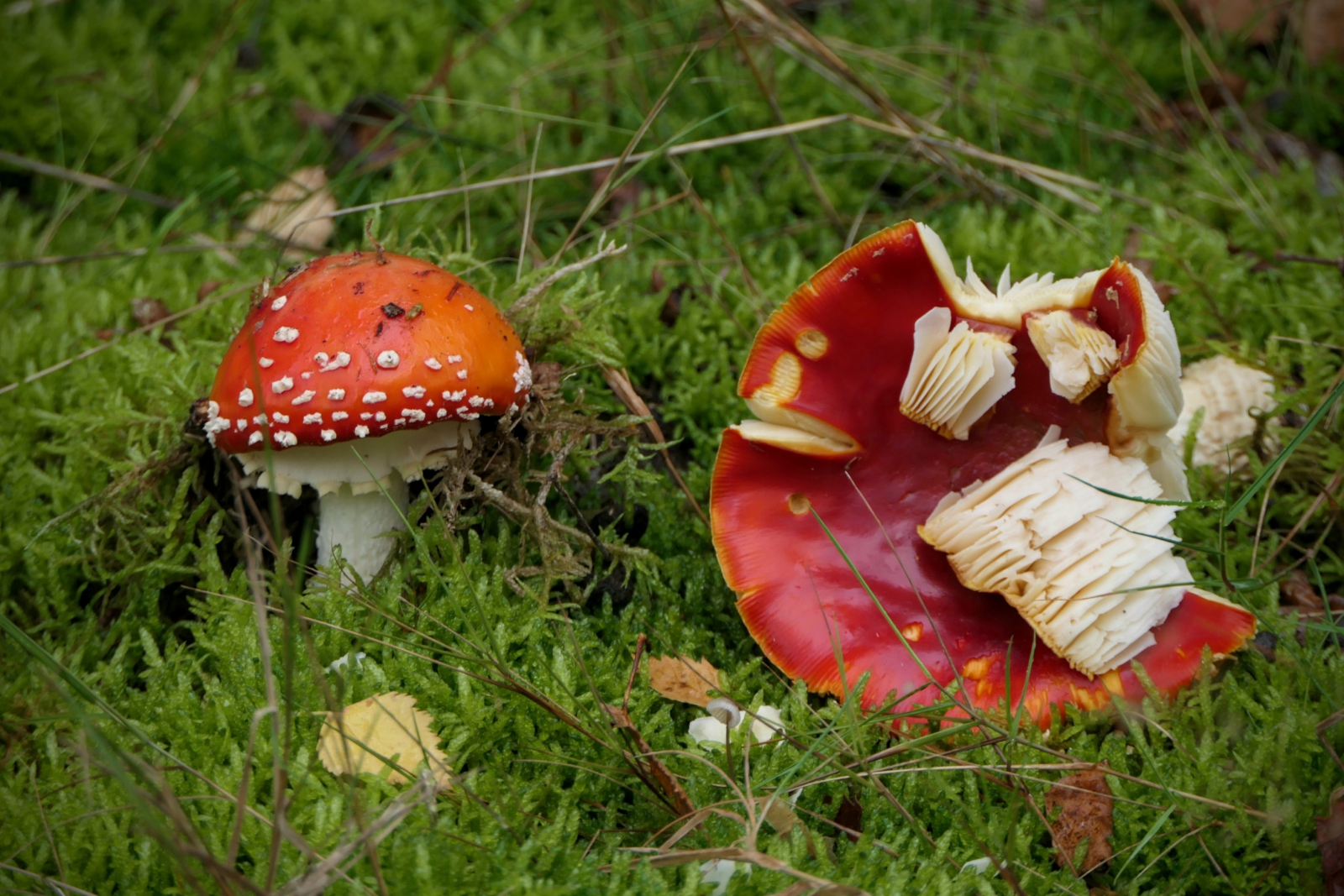 Een van deze prachtige vliegenzwammen is jammer genoeg helemaal stuk, waarschijnlijk omver gelopen door een of ander dier.