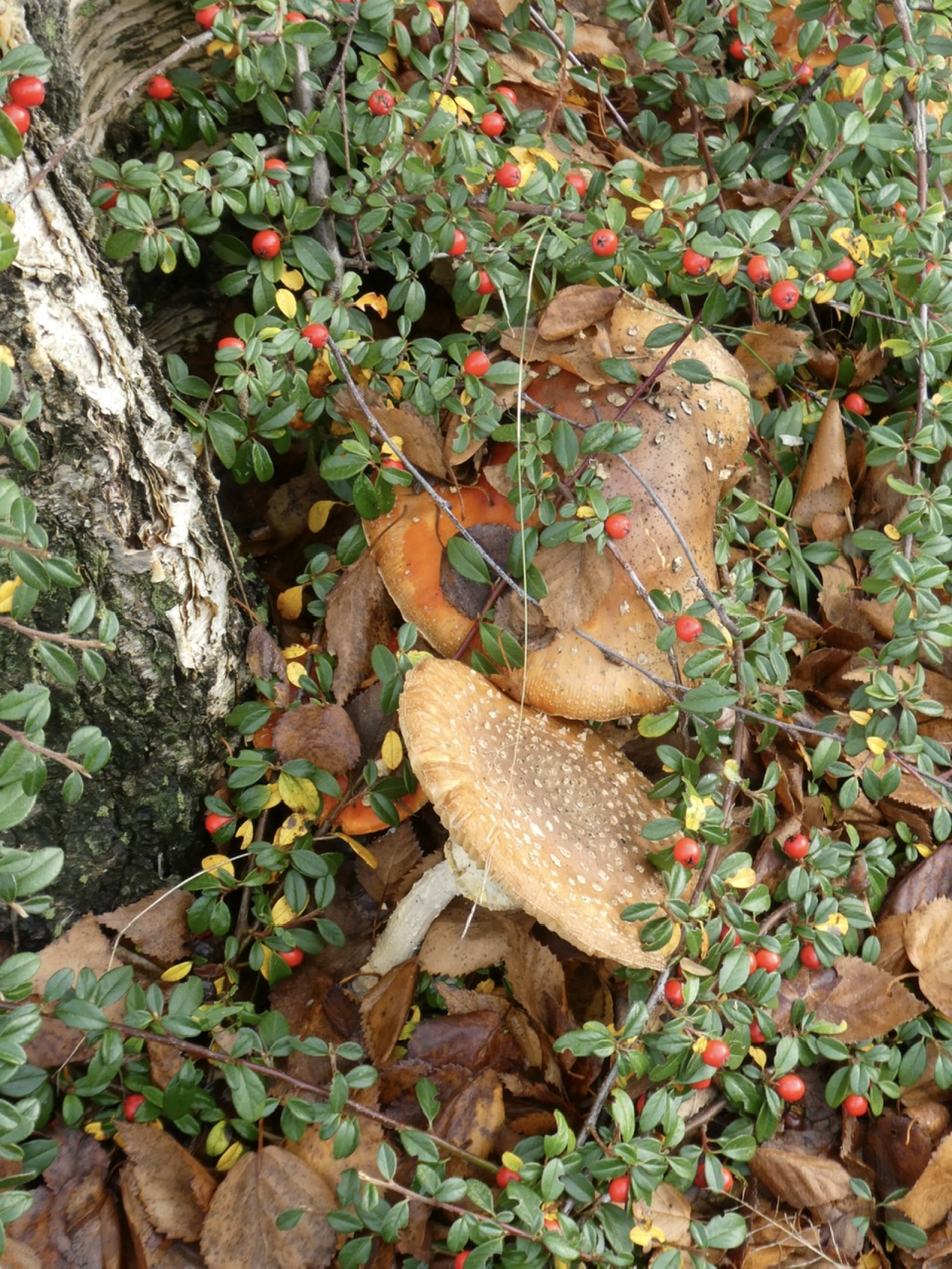 Aan de voet van een berk verborgen onder de grondbedekkers, niet te zien of het er drie of vier zijn.