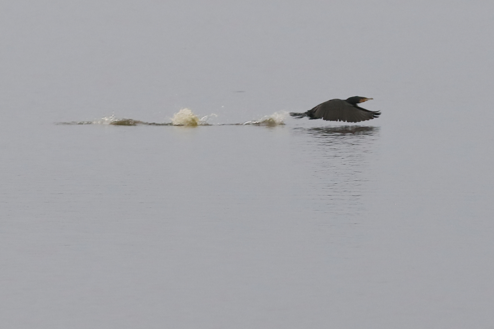 Goede foto. Door de plopjes achter de vogel is duidelijk dat hij 'hoppend' over het water gaat !!