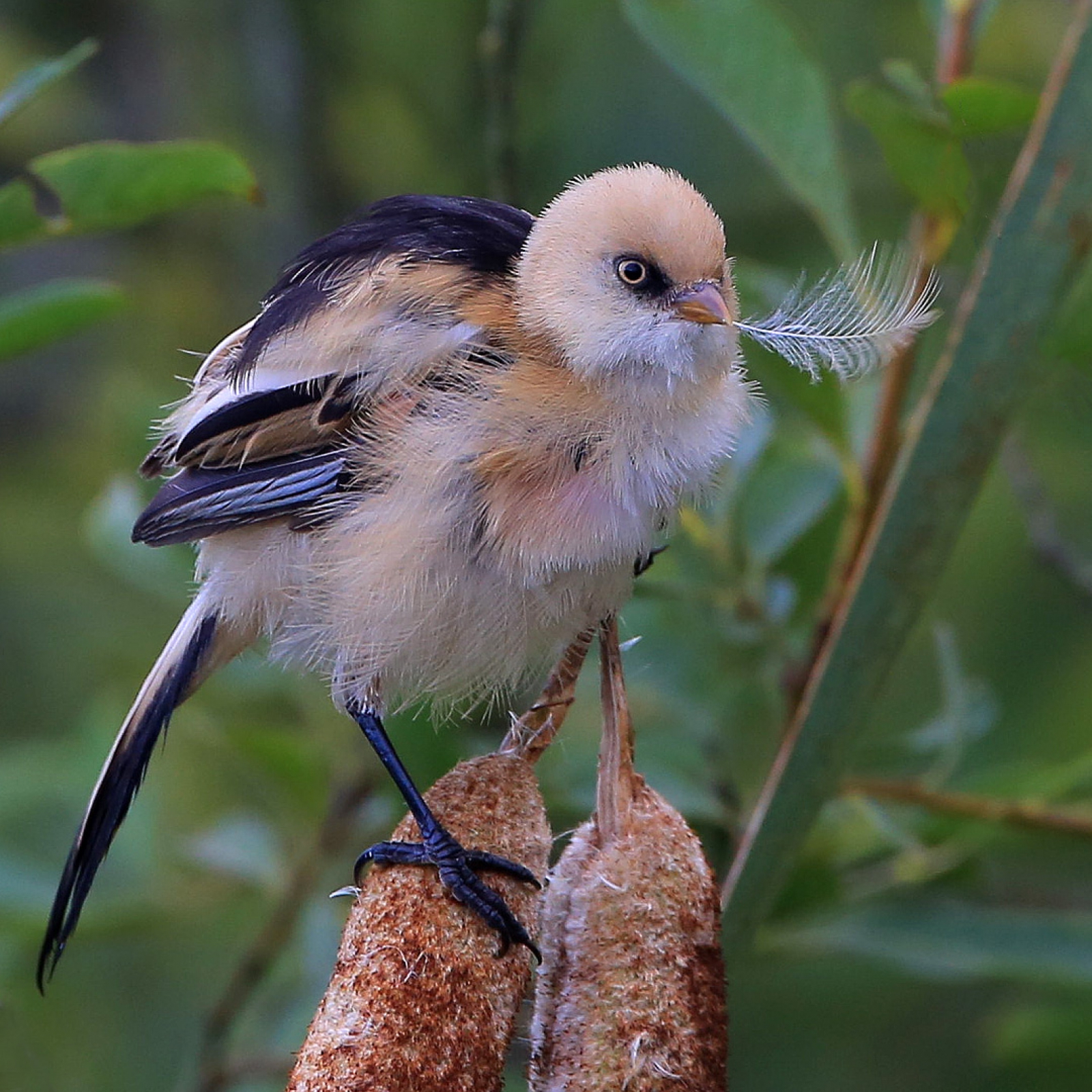 Een juveniel Baardmannetje is zich aan het wassen op een mooie voedselrijke plek. Met een veertje in haar snavel maakt ze de poetsbeurt compleet... (even swifferen... ;-) )