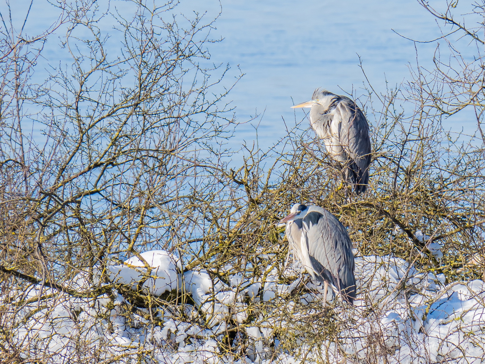 Begin februari 2021. Even echt winter. De reigers rusten, maken zich dik om zo warme lucht tussen de vleugels vast te houden. Ze zitten op een struik in een droog stukje land tussen de IJssel en een ondergelopen weiland in Doesburg.