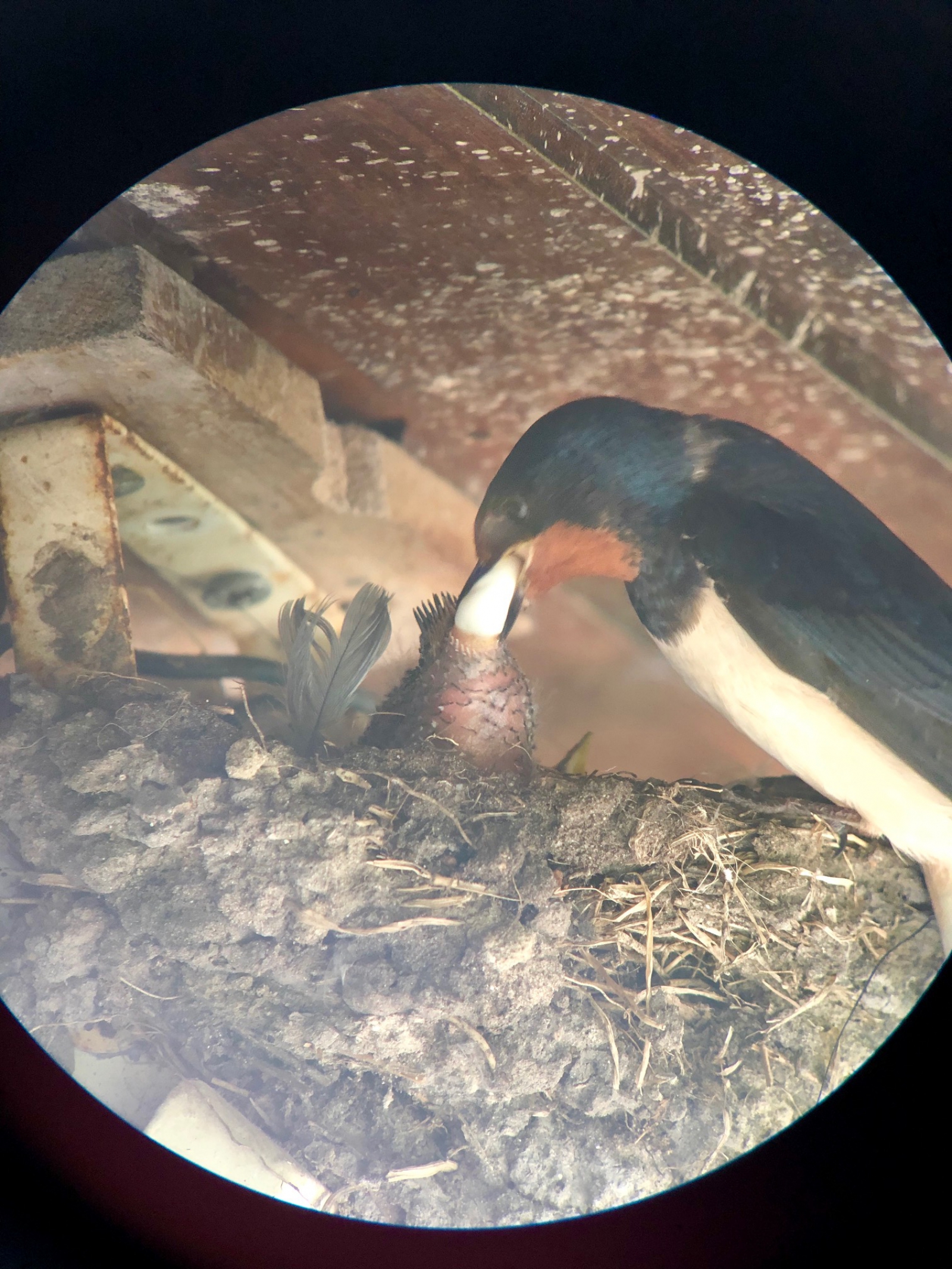 een nestje boerenzwaluwen bij onze voordeur. Wie weet wat hier nou precies gebeurt? Het leek alsof pa of ma boerenzwaluw daarna er mee weg vloog.