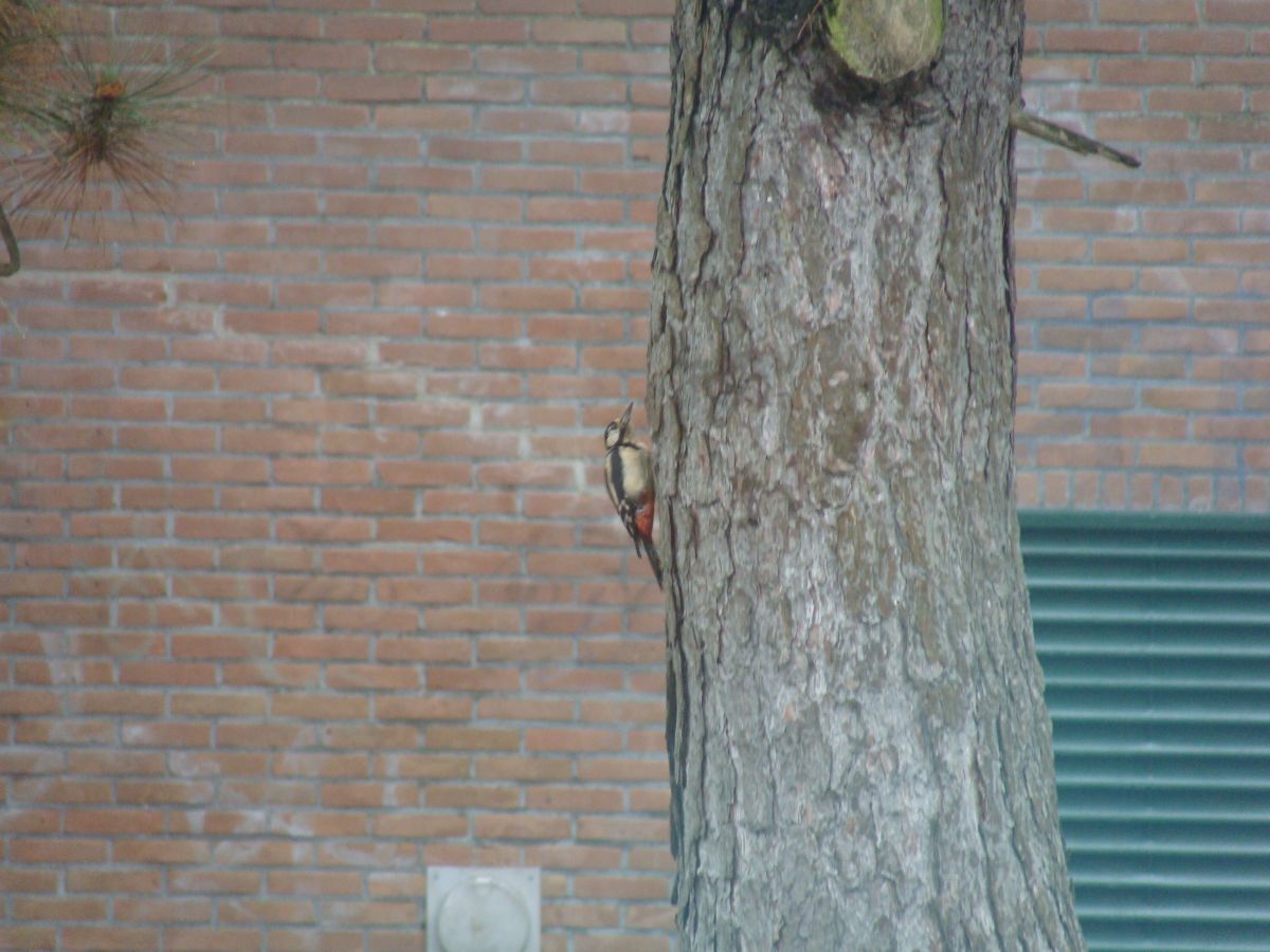 Er zat een bonte specht in de dennenboom in een straat tegenover ons huis.