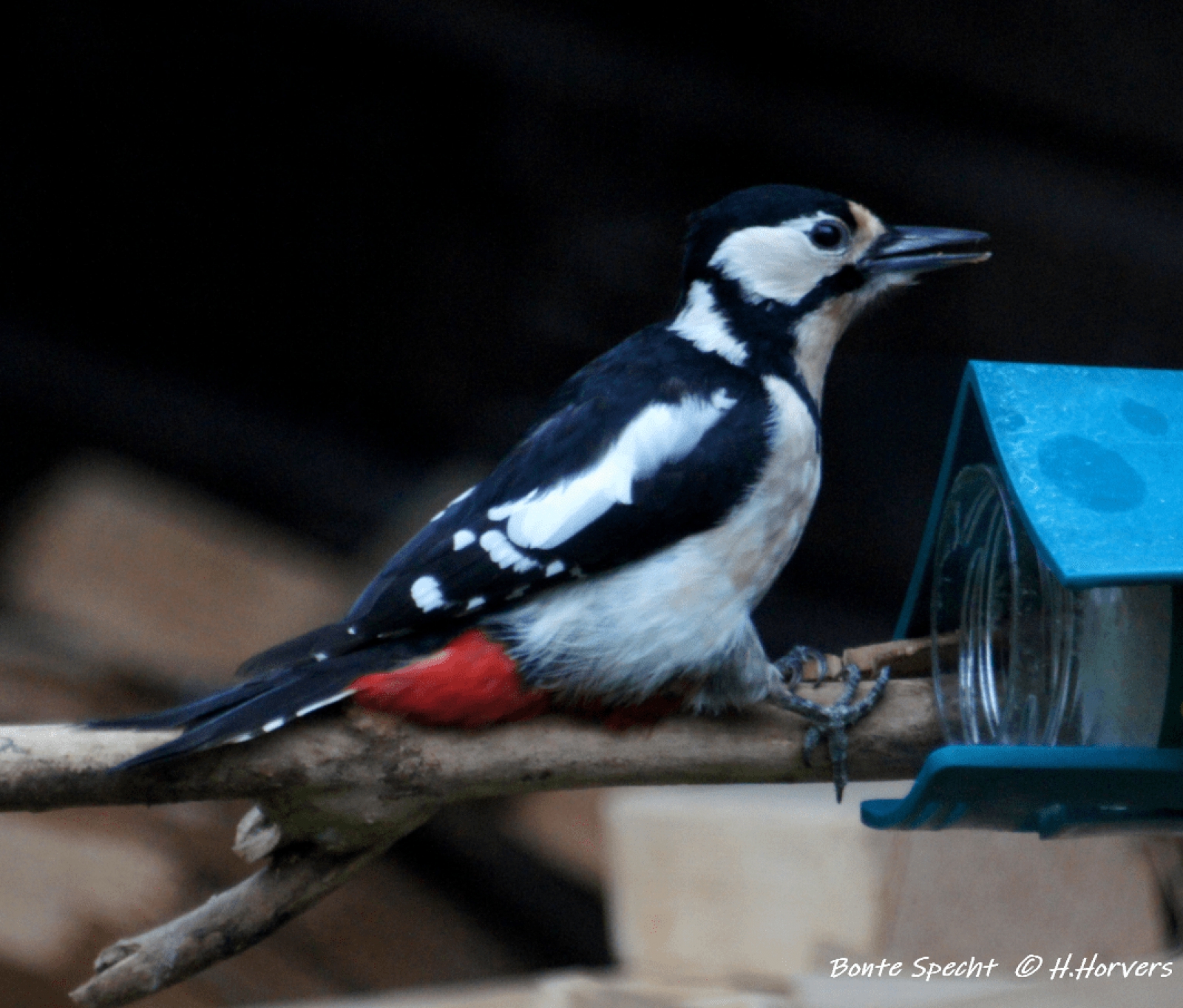Bonte Specht bij de pindakaas, hij is er maar bij gaan zitten ...