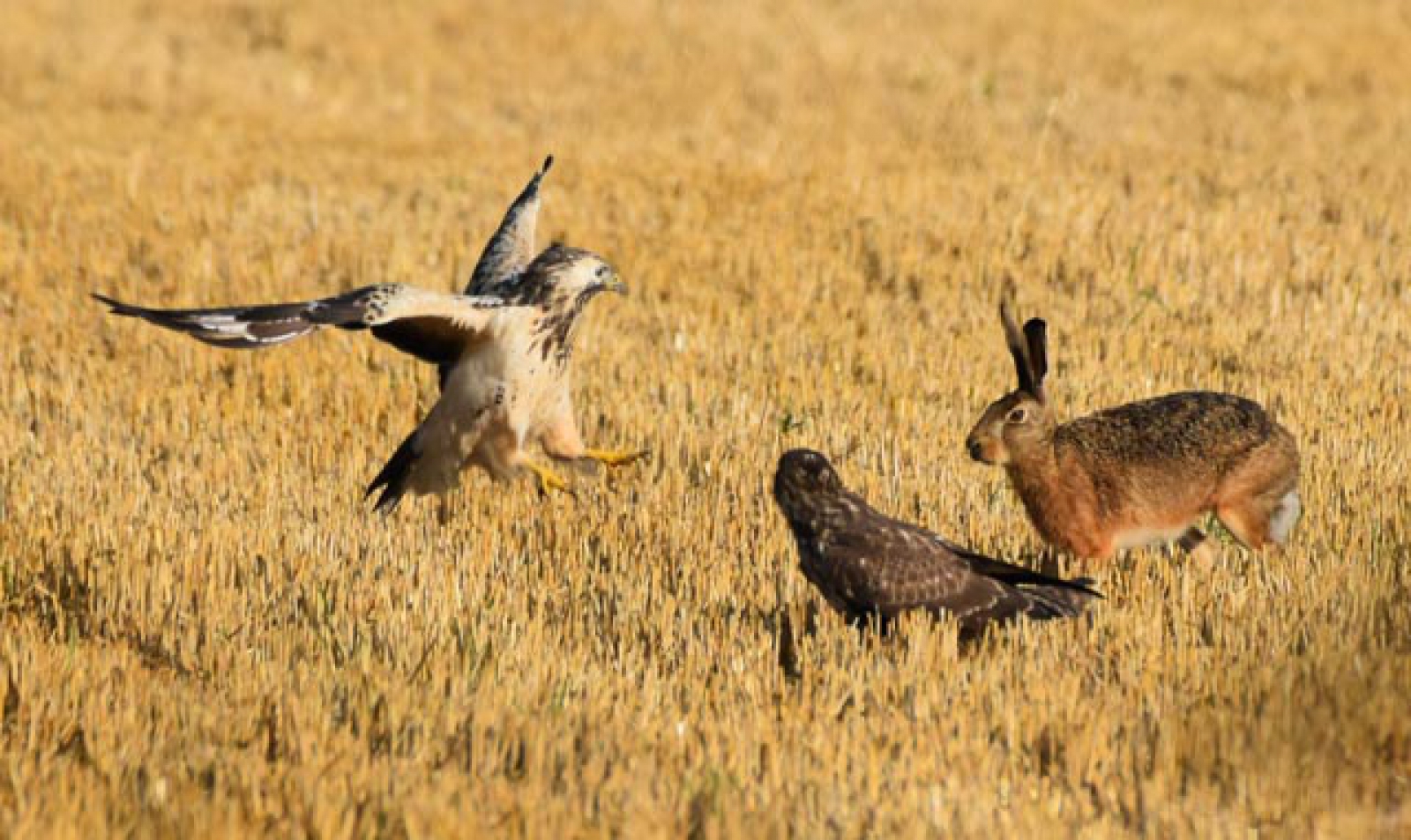 Haas valt Buizerd familie aan en verdwijnt vervolgens weer snel in het links gelegen bietenveld