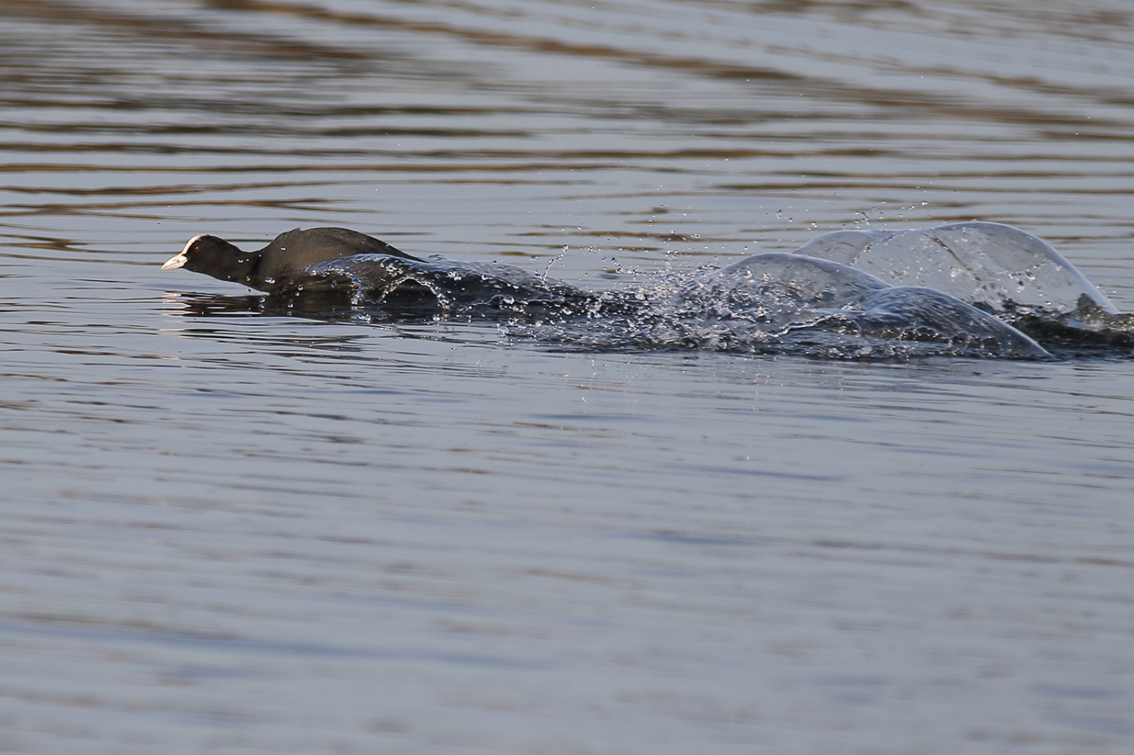 Met Ma-meerkoet en kleintjes in de buurt vond Pa dat een andere meerkoet te dichtbij kwam....