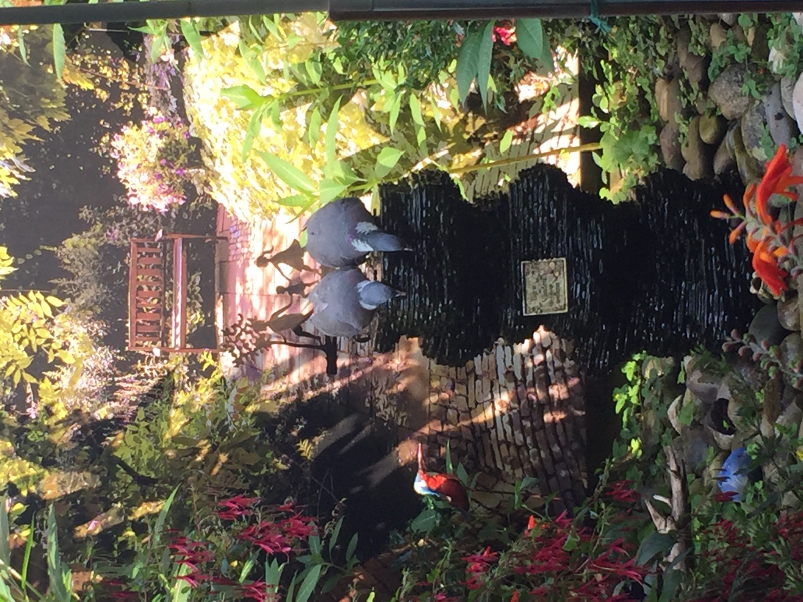 Tijdens de warme dagen zochten deze houtduiven meestal apart, maar deze keer tegelijk verkoeling op de watersokkel. Hier lijkt de een de ander te vragen: ‘Kun jij lezen wat op dat bordje staat?’ Ingrid van Dullink, 20-8-2020