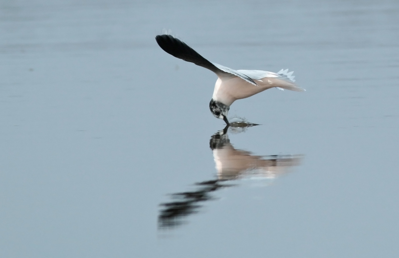 Een Dwergmeeuwtje pikt een piepklein vliegje van het water.