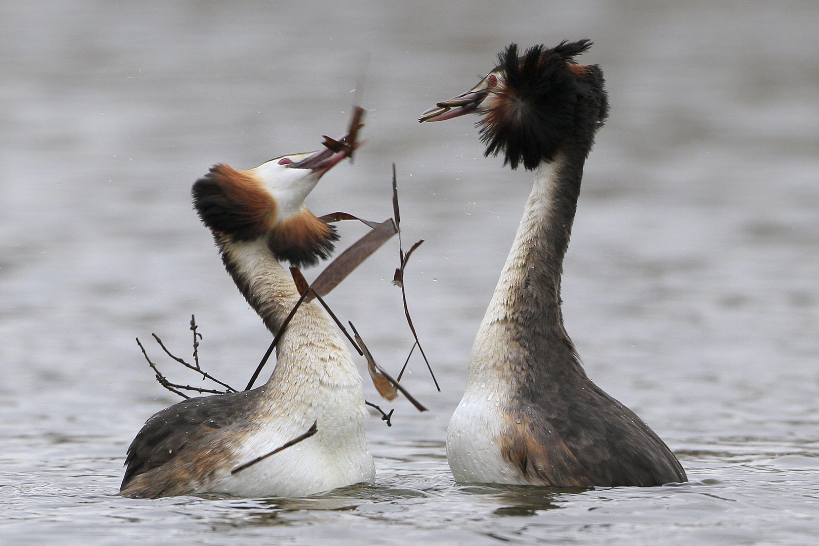 Tijdens de balts wordt door beide partners nestmateriaal opgedoken... Hier een verstild moment van loslaten van de bouwstoffen...