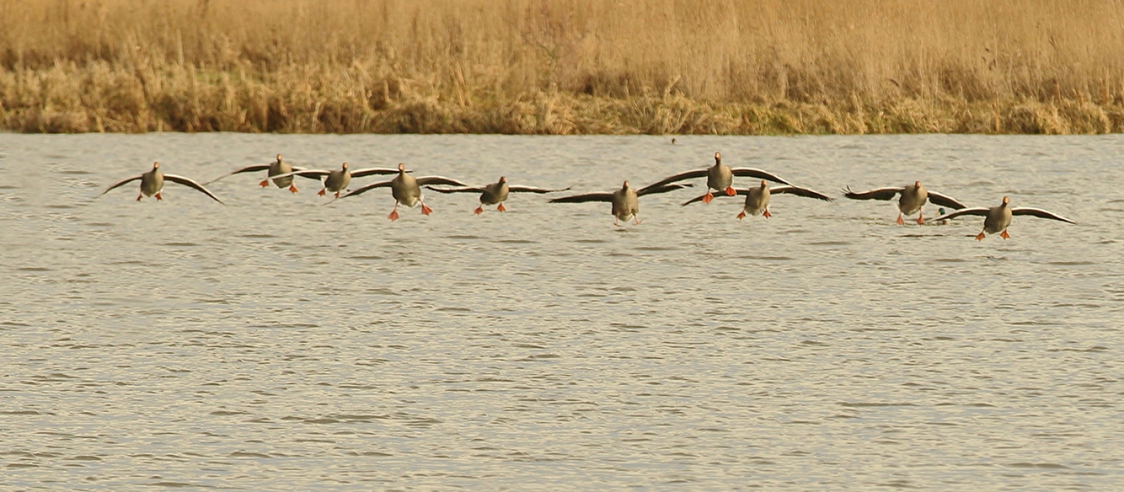 groep grauwe ganzen komt aanvliegen
