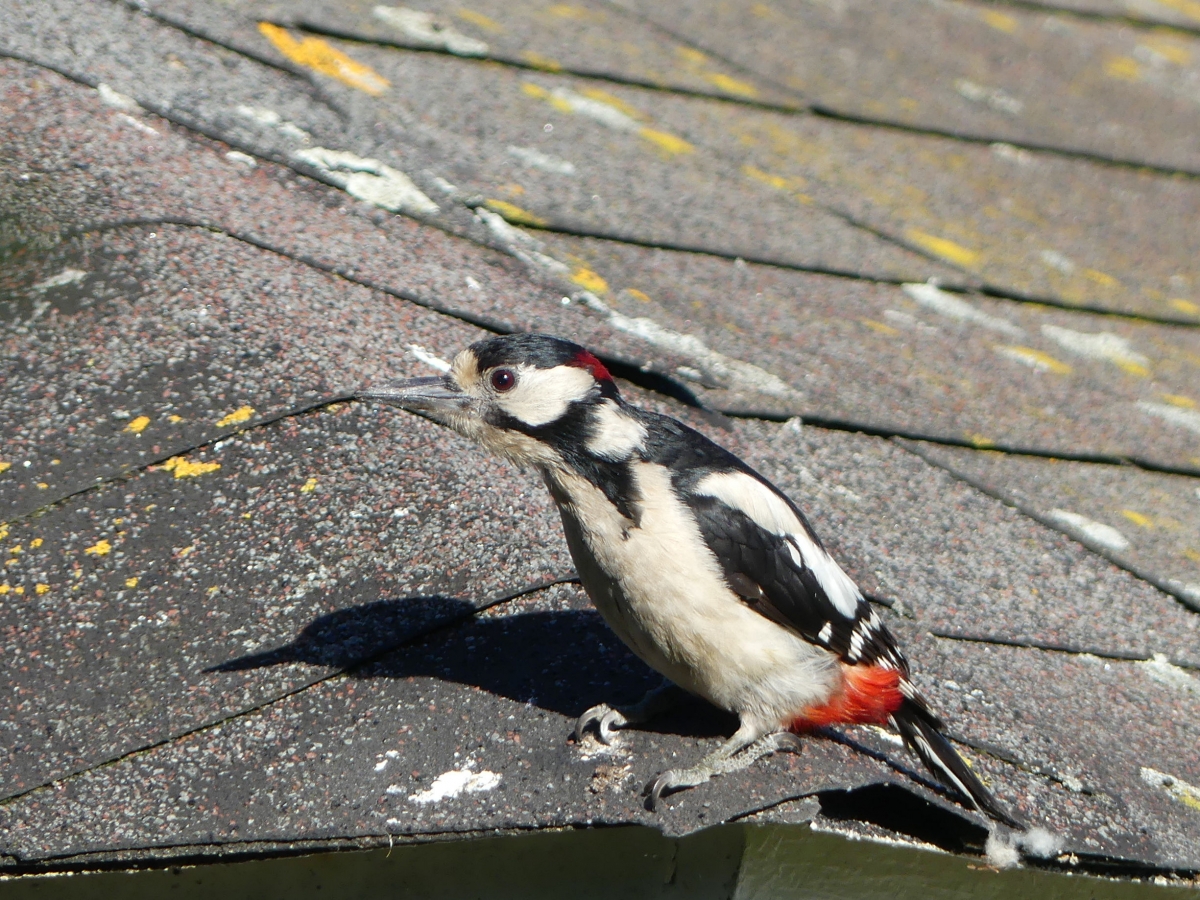 Op het schuurdak zit de Grote Bonte Specht. Op weg naar de pot pindakaas welke onder de dakrand hangt.