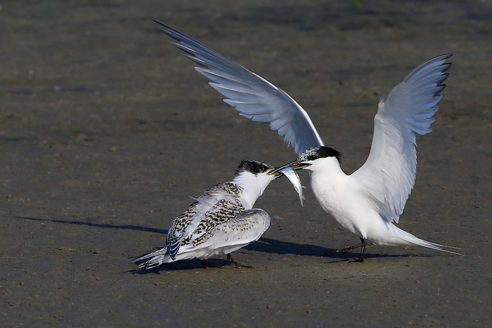 Een geslaagde visoverdracht. Op zich zie je dit niet zo vaak van dichtbij en zeker niet in alle rust. De Kokmeeuwen zijn voortdurend ook op de aangeleverde visjes aan het azen...