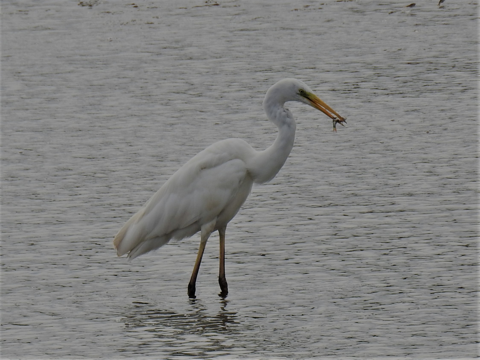 Met zijn lengte van 85 - 100 cm is de grote zilverreiger even groot als de blauwe reiger. Hier heeft hij net een visje gevangen.