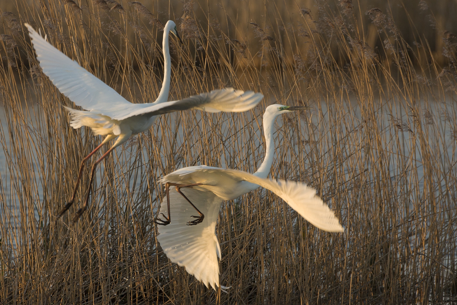 Een sierlijke Interactie tussen twee Grote Zilverreigers in broedkleed... Ook het licht werkte mooi mee aan de tot standkoming van dit beeld. Blij mee ! :-)
