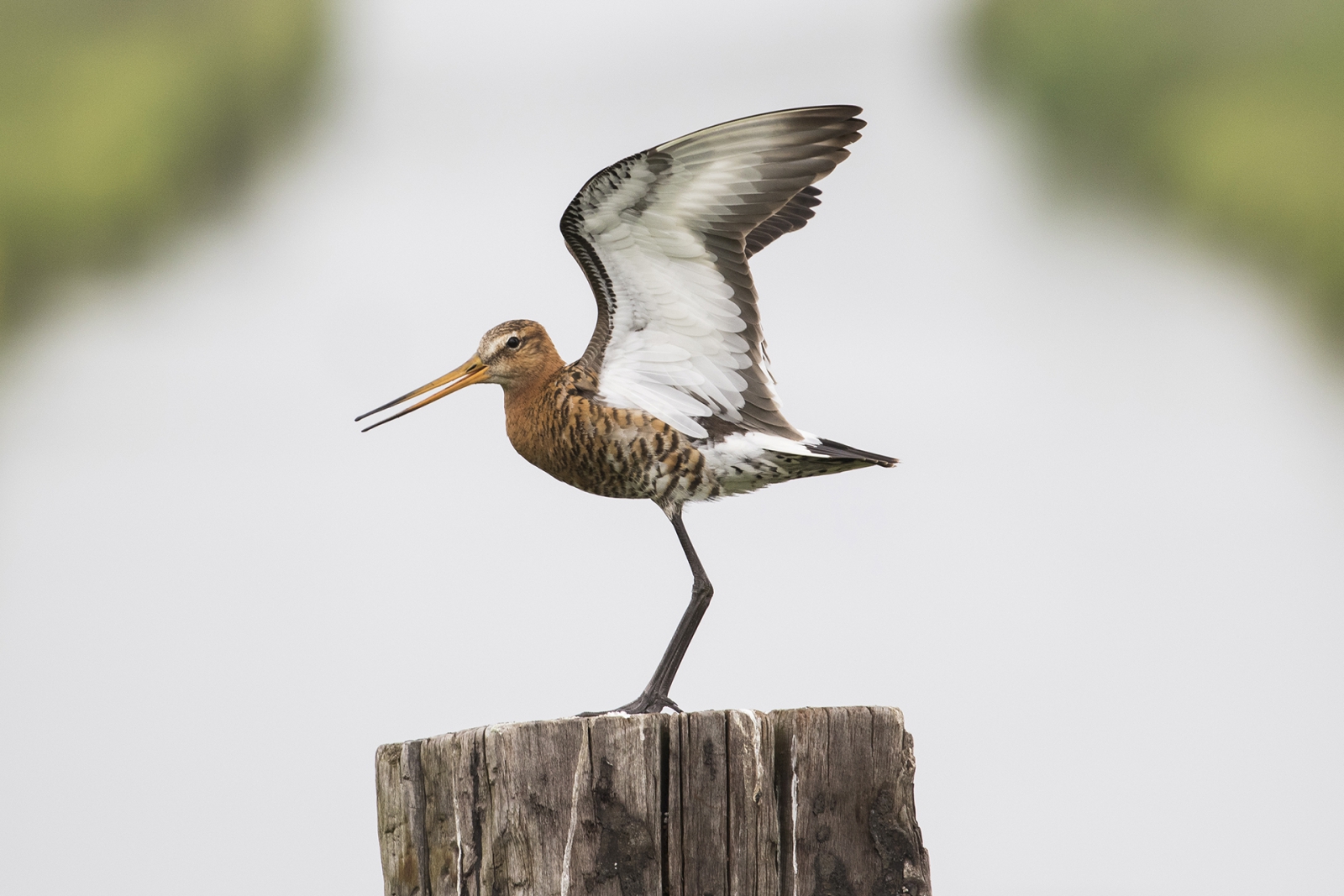 Alarmerende grutto man op paal in Polder Krimpen aan de Lek, wakend over twee kuikens van een paar dagen oud.