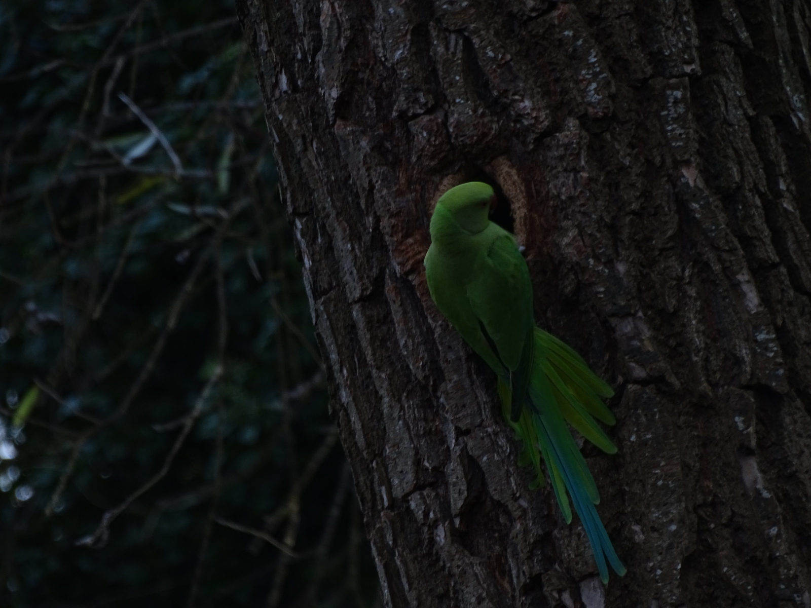 deze halsbandparkiet ging voor mijn neus voor een oud spechtennest zitten.
