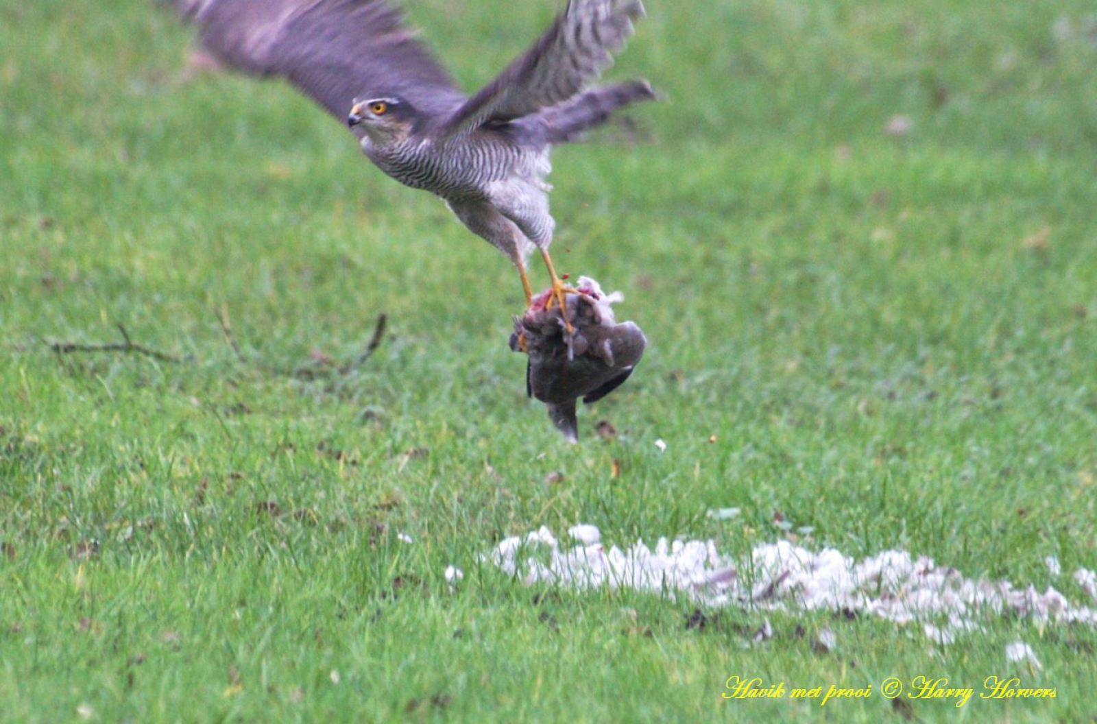 Vanuit de huiskamer genomen . Opvliegende havik met prooi Blijkbaar vond hij alle aandacht te veel worden ...