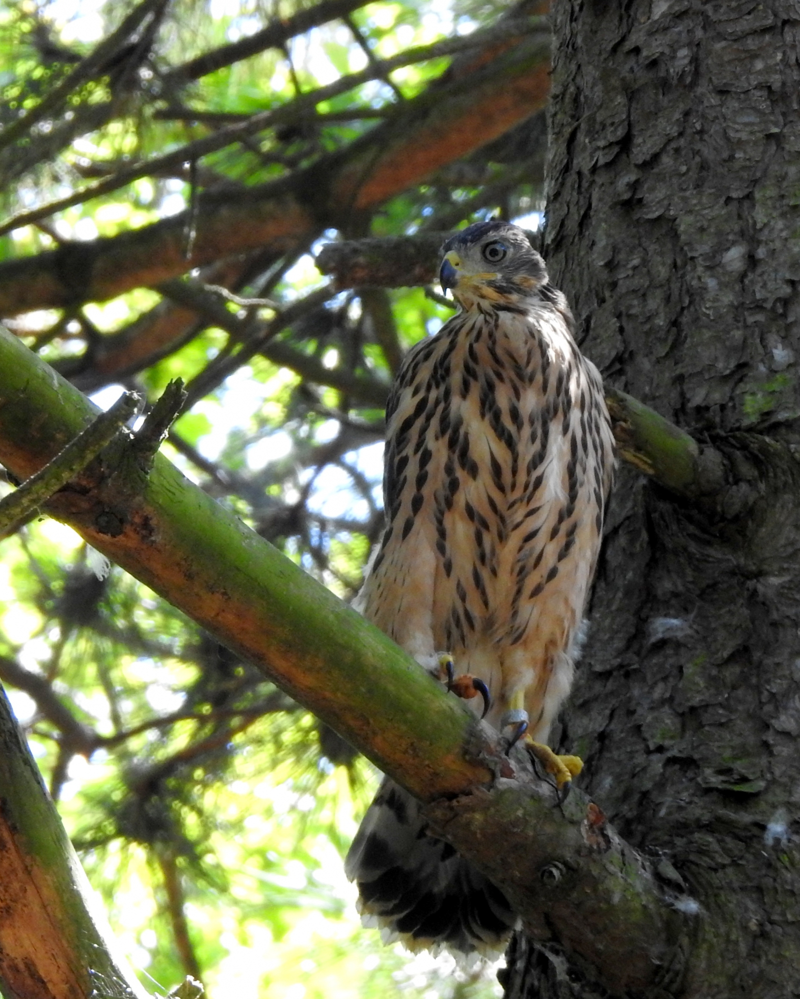 Ik liep in een zonnig gebied in de AWD toen ik alsmaar een jonge roofvogel hoorde roepen. Nieuwsgierig dook ik het bos in, niet verwachtend dat ik het nest zou ontdekken. Maar daar halverwege een hoge boom zag ik, bijna rondom, het nest. Een groot slordig nest van stevige dode takken bekleed met boomschors en bosjes dennennaalden. Het mannetje is voornamelijk verantwoordelijk voor de bouw van het nest. Daarboven op een tak zat een juveniele Havik te peeuwen om eten.