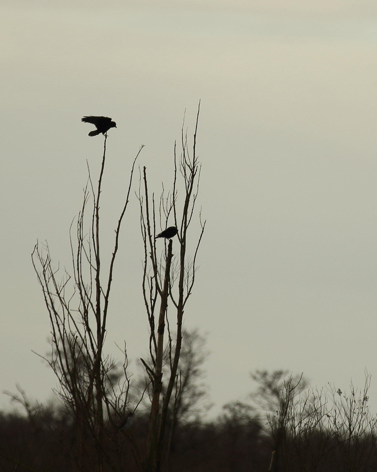 Buizerd [onderste vogel] had niet in de gaten dat een Havik boven in de boom landde. Deze samenkomst was van korte duur want de buizerd ging er snel van door.