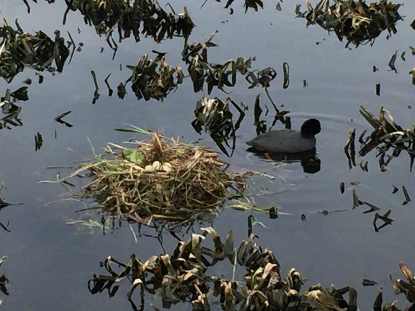 27-3-2019 Lekkerkerk omgeving. Dit meerkoetje voel met haar nest bijna niet op als je er snel langs raast.