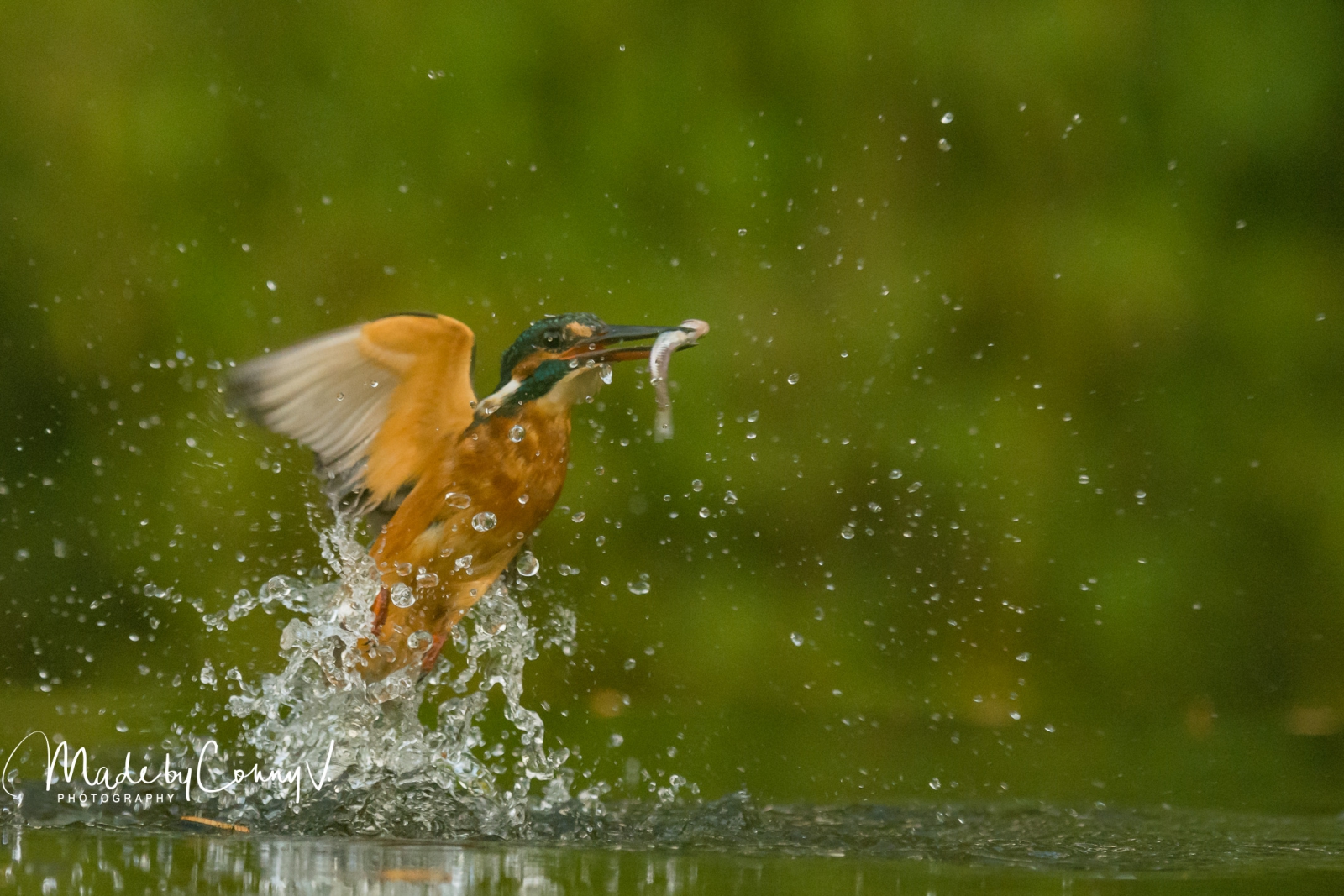 De Ijsvogel die uit het water omhoog komt met een gevangen visje.