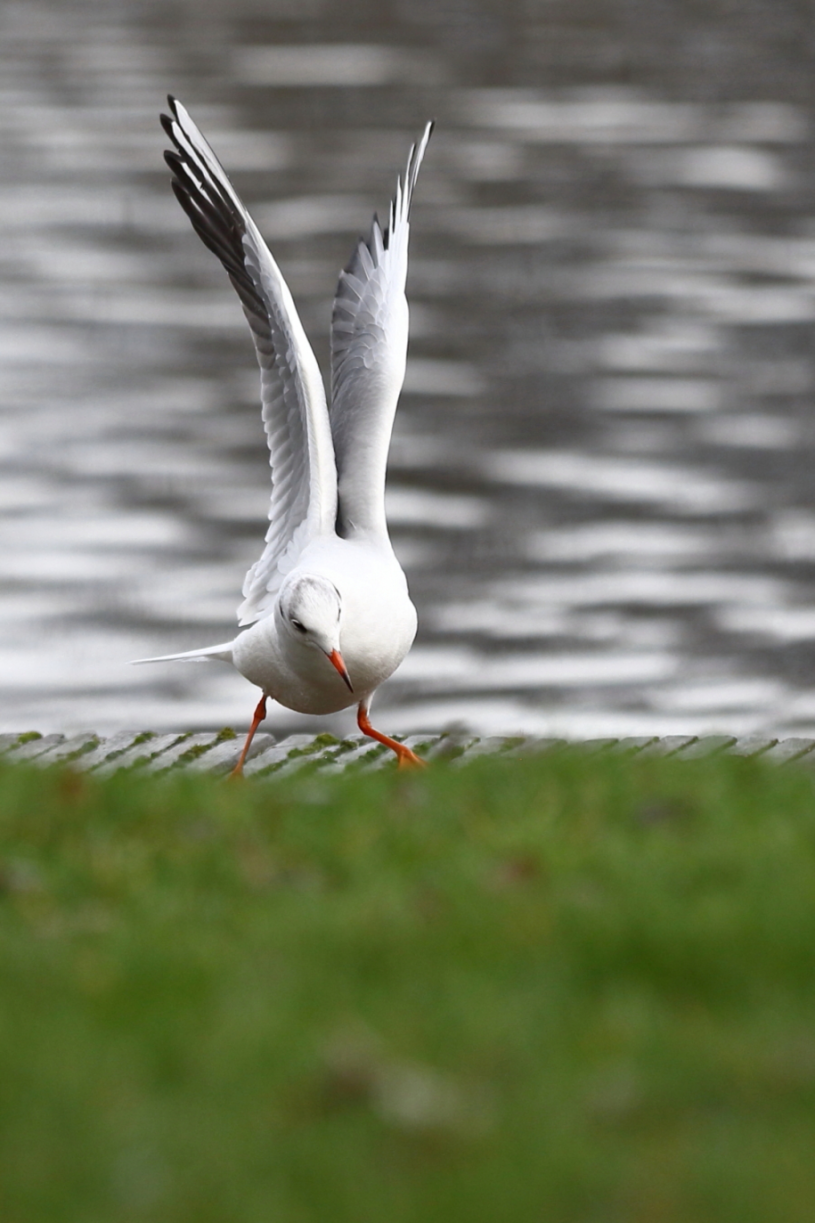 kokmeeuw [winterkleed] landt op het randje van een steiger