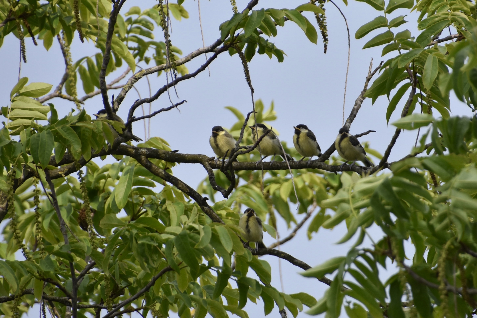 De 6 koolmeesjes uit ons nestkastje zijn uitgevlogen, gisteren aan het eind van de middag, zaten ze boven in de vleugelnoot te wachten tot de ouders eten kwamen brengen.