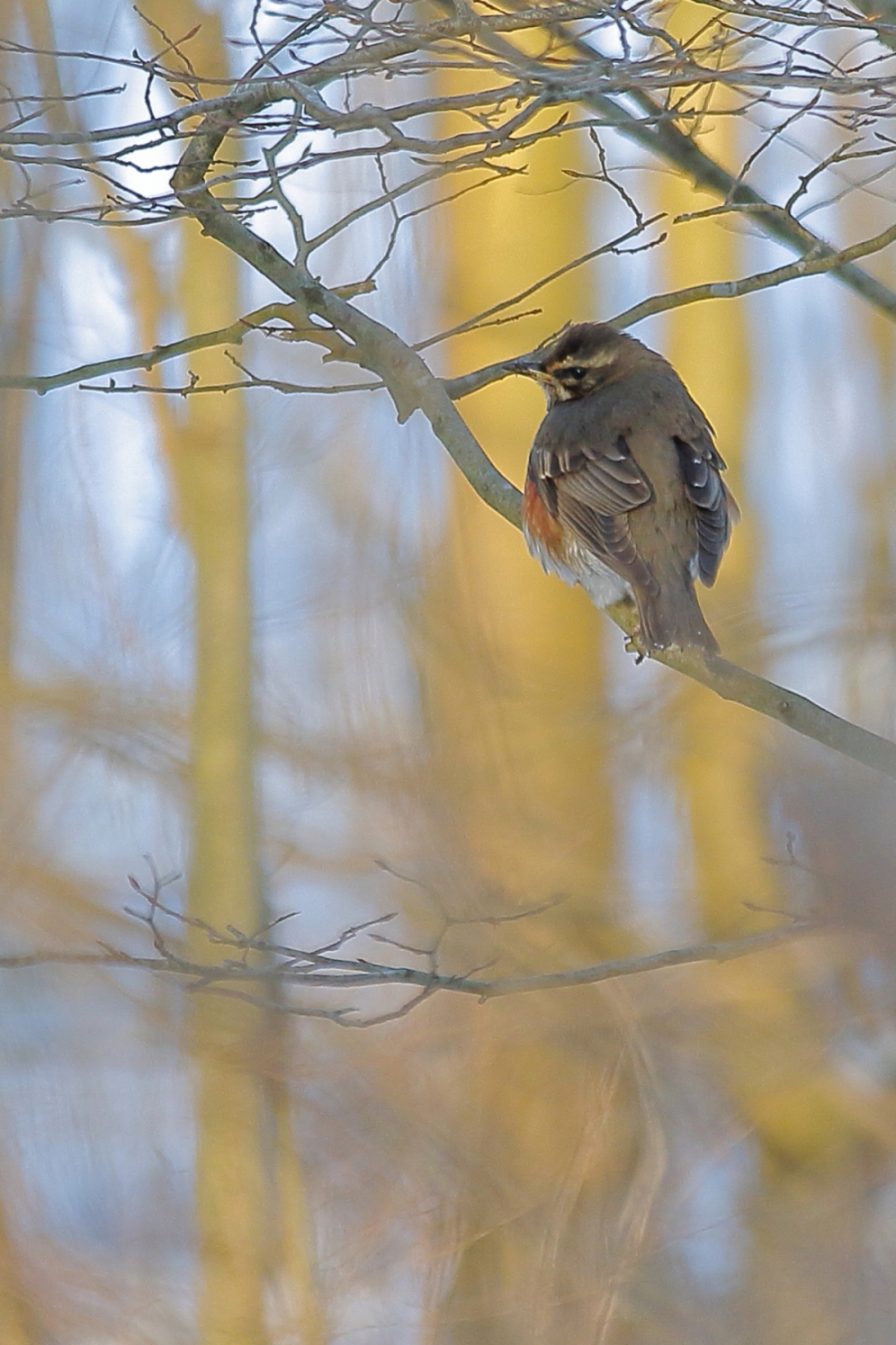 Prachtfoto van deze koperwiek. Ook mooi: de achtergrond met wat wazige, door de zon beschenen boomstammen...